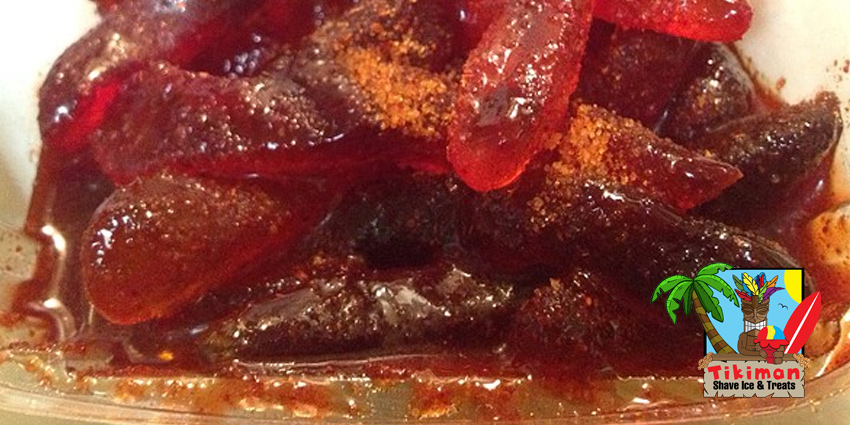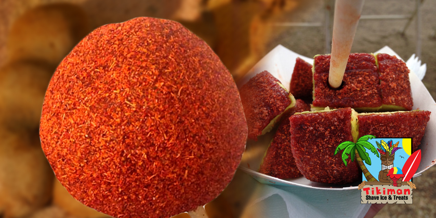 Mango natural fruit sorbet with red chamoy and lucas powder. This is our most preferred treat at Tikimans!